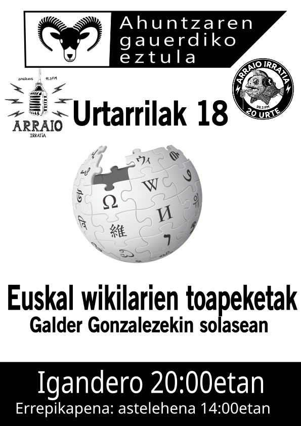 Gaur, urtarrilak 18, gure irratsaioan makina bat aldiz erabili dugun tresna bati buruz aritu gara: Wikipedia entziklopedia askea. Euskal Wikilarien Topaketak antolatu dituzte datorren astebururako eta gainera 25 urte bete berri ditu euskarazko Wikipediak. Guzti honi buruz, eta gauza gehiagoz ere, hitzegitera etorri zaigu Galder Gonzalez.