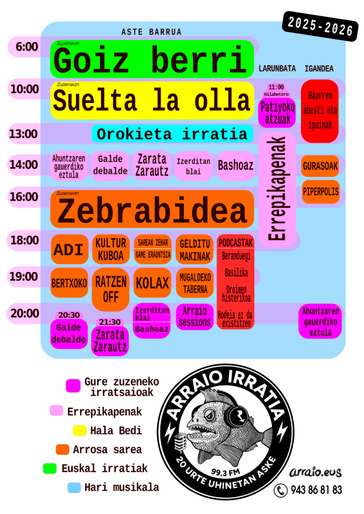 GELDITZEN ZERA EDO BASHOAZ: Ez da soilik galdera bat, geratzeko gonbidapena ere bada. Non BASH taldearen ekarpenak entzutera animatzen zaituztegu bi mari zororen konpainian. Egunerokotasunean sortzen diren eta aniztasunean loratzen diren elkarrizketetan murgilduz. Bi asteazkenetatik behin 20:00etan Arraio Irratian!